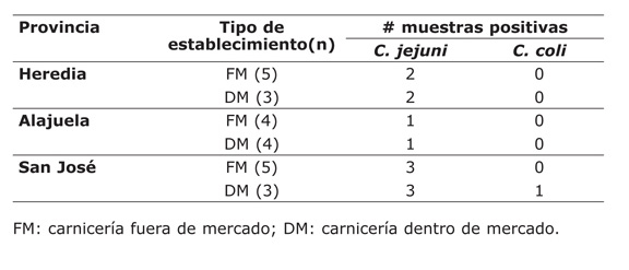 En puntos de venta, las muestras se recolectaron con la siguiente distribución según provincia: 8 de Alajuela, 8 de Heredia y 8 de San José, todas en el Gran Área Metropolitana. En el Cuadro 2, se presenta la distribución de las muestras positivas según la ubicación de los puntos de venta.