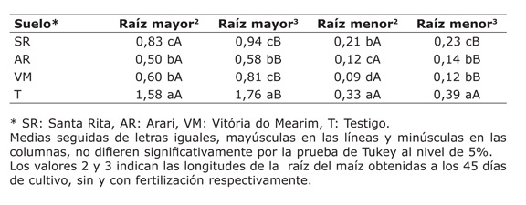 Cuadro 4. Longitud (m) de la raíz del maíz, en presencia y ausencia de fertilización, en suelos con alto contenido de aluminio colectados en la Baixada Marahense, Estado de Maranhão, Brasil. 2009.