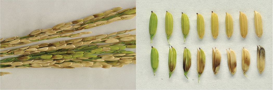 Esta enfermedad se caracteriza en el arroz por la presencia de panículas café o decoloradas debido a un proceso de clorosis. Las ramas y panículas se mantienen verdes al inicio, sin lesiones ni presencia de decoloración, y las flores afectadas detienen el crecimiento o son abortadas por la planta. Las panículas afectadas pueden tener pocas o todas las flores enfermas (Yang, 2004). Los granos pueden mostrar diferentes grados de decoloración dependiendo de la intensidad de la infección (Zhou et al., 2011) (Figura 1).