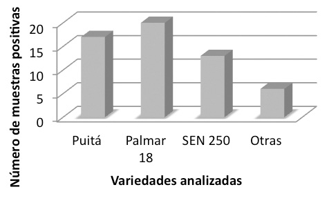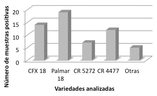Durante el año 2009 se analizaron un total de 113 muestras de diferentes variedades, Puitá, Palmar 18 y SEN 250 entre otras, todas provenientes de las región Chorotega y de ellas el 49% estaban infectadas con B. glumae (Figura 2).