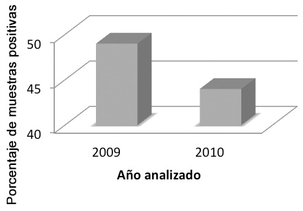 La Figura 4 representa los porcentajes de positividad de las muestras analizadas durante el periodo 2009-2010, en ambos casos, las muestras no superaron el 50% y en el segundo periodo se obtuvo un 5% menos de positividad con respecto al primer año estudiado.