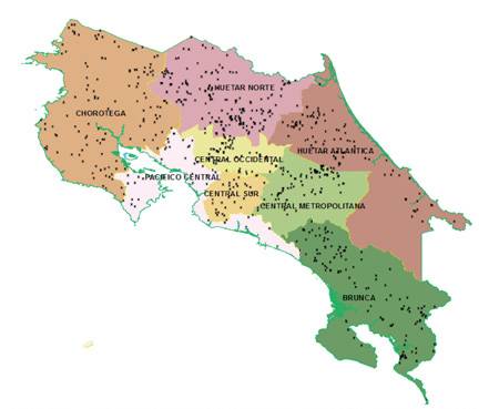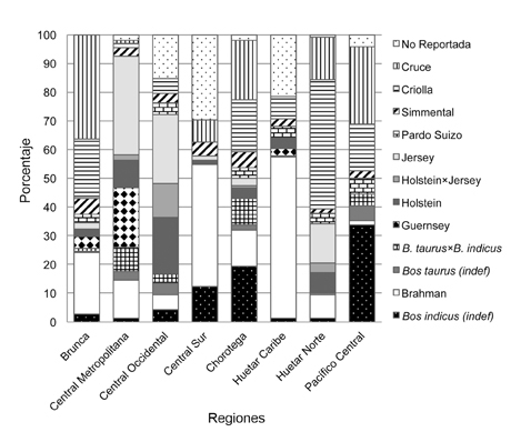 Esta estructura fue congruente con lo observado a nivel de campo. En las regiones Central Metropolitana y Central Occidental, además de su proximidad geográfica, existió una predominancia de ganado lechero especializado tipo Bos taurus. Estas regiones son de topografía irregular, de altitud media a elevada, con temperaturas promedio entre 15 y 20 °C, adecuadas para la cría de razas lecheras exóticas como Holstein y Jersey. Por el contrario, en las regiones Central Sur, Chorotega, Pacífico Central y Huetar Caribe, predominaron las razas de carne tipo Bos indicus o los cruces Bos taurus×Bos indicus. Son regiones más bajas y cercanas a las costas, generalmente de clima cálido/seco o cálido/húmedo. Por último, las regiones Huetar Norte y Brunca son zonas relativamente extensas localizadas en el extremo norte y sur-este del país, respectivamente, ambas con topografía y condiciones climáticas irregulares, por lo que en ellas se encontró una población ganadera de mayor diversidad racial, lo que se apreció en la posición intermedia que presentaron en el dendrograma por regiones. Además, la región Huetar Norte poseía un 30% de la población ganadera del país, lo que sin duda, también contribuyó a que presentase una mayor diversidad genética.