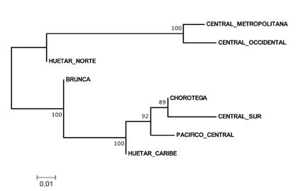 En el dendrograma construido con base en las frecuencias alélicas por región (Figura 3) se observó como las regiones Central Metropolitana y Central Occidental se separaron en la rama superior del árbol. De igual manera, en la rama inferior se separaron las regiones Central Sur, Chorotega, Pacífico Central y Huetar Caribe. Las dos regiones restantes, Brunca y Huetar Norte, se ubicaron en un punto intermedio entre las anteriores. Solo dos de los valores de remuestreo fueron diferentes de 100, lo que indica que existió fuerte evidencia para separar los tres grupos mencionados anteriormente, y menor evidencia en las últimas dos subdivisiones de la ramificación inferior.