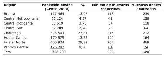 Se realizó un cálculo preliminar del tamaño mínimo de muestra para medir con precisión adecuada las frecuencias alélicas de los marcadores evaluados. El cálculo se basó en un test de bondad de ajuste chi cuadrado, según el programa GPower v.3.1. (Faul et al., 2007). Entre los parámetros requeridos para el cálculo se consideró el número de regiones por muestrear (8), la cantidad esperada de alelos por marcador (8), el nivel de precisión o tamaño de efecto (0,15 desviaciones estándares), así como un nivel de confianza de 95% y una potencia estadística de 90%. A partir de estos parámetros se obtuvo un número mínimo de alelos a muestrear de 1809, equivalentes a 905 individuos. Este número se distribuyó de forma proporcional entre las diferentes regiones del país (Cuadro 1, Figura 1), con base en la estructura de la población bovina reportada en el último censo ganadero (CORFOGA, 2000), lo que permitió obtener un estimado de la cantidad mínima de muestras requeridas por región.