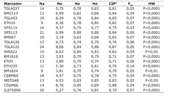 Los promedios de heterocigosis observada (Ho) y esperada (He) fueron de 0,76±0,01 y 0,80±0,01, respectivamente. El marcador de menor He fue RM067 con 0,68 y el de mayor He fue CSSM66 con 0,89 (Cuadro 2). El contenido de información polimórfica (CIP) ratificó esta alta variabilidad variando desde un mínimo de 0,65 para el marcador RM067 hasta un máximo de 0,88 para el marcador CSSM66. Estos valores también tendieron a ser mayores a los reportados por estudios similares (Maudet et al., 2002; Steigleder et al., 2004; Pizarro et al., 2009; Martín-Burriel et al., 2011; Villalobos-Cortés et al., 2011; Acosta et al., 2013), lo que nuevamente podría ligarse a las características del muestreo, principalmente a la inclusión de mayor diversidad de grupos raciales.