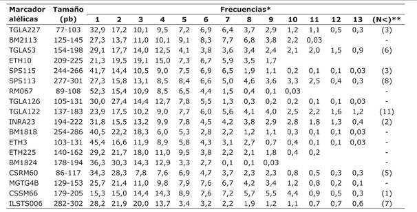 Al contabilizar las frecuencias alélicas por marcador, se destaca la alta diversidad, ya que todos los marcadores evaluados fueron polimórficos (Cuadro 2). El promedio de alelos observados por marcador fue de 14,6±1,01, variando entre nueve para ETH10 y BM1824 y veinticuatro para TGL122 (Cuadro 2). A pesar del alto número de alelos por marcador, se observó una alta proporción con frecuencias bajas (<5%), por lo que el número de efectivos (Ne) fue mucho menor (5,59±0,36) (Cuadro 3).