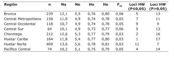 La variabilidad genética fue similar y alta en todas las regiones del país (Cuadro 4). La heterocigosis observada (Ho) varió desde 0,73 para la región Central Sur hasta 0,78 para la región Huetar Norte. Sin embargo, estos estimados, no difirieron significativamente entre sí (P>0,05). En todas las regiones se observó una deficiencia de heterocigotas (Ho<He) que varió entre 2 y 4%, siguiendo el mismo patrón señalado previamente a nivel nacional.