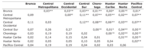Las distancias genéticas de (Nei, 1972) (bajo la diagonal, Cuadro 5) variaron entre 0,01 (Chorotega vs. Huetar Caribe) y 0,27 (Central Occidental vs. Central Sur). Las diferencias RST entre pares de regiones (Cuadro 5, sobre la diagonal) ratificaron lo observado en el dendrograma, ya que se encontraron diferencias significativas entre las regiones situadas en las tres secciones del árbol (superior, intermedia e inferior), mientras que las diferencias entre regiones dentro de cada sección tendieron a no ser significativas.