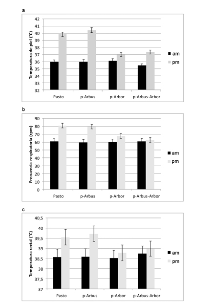 En la hora de mayor calor (pm), los tratamientos Testigo (pasto) y con solo arbustos (p-Arbus) presentaron una mayor FR (p<0,05) comparados con los tratamientos con sombrío proveniente de árboles (p-Arbor y p-Arbus-Arbor) (Figura 2). La TR tuvo el mismo comportamiento de la FR con diferencias significativas (p<0,05) entre la medición am y pm para los tratamientos pasto y p-Arbus y sin diferencia significativa (p>0,05) para los p-Arbor y p-Arbus-Arbor). En el tratamiento pasto, la TR ascendió 1 ºC y en el p-Arbus aumentó 1,1 °C, al pasar de la medición am a pm, siendo en ambos casos significativa (p<0,05), lo que representó un incremento de 2,51% y 2,93%, respectivamente. En la medición de mayor calor (pm), y por lo tanto, de mayor susceptibilidad a estrés calórico, los animales que se encontraban en los sistemas silvopastoriles p-Arbor y p-Arbus-Arbor tuvieron una menor TR (p<0,05) comparada con la de los animales de los tratamientos pasto y p-Arbus. En esta hora, la TR de los animales que se encontraban en los sistemas silvopastoriles con cobertura arbórea (p-Arbor y p-Arbus-Arbor), en promedio, no rebasó el límite superior de 39,1 ºC descrito por (Cunningham, 2003) como inicio de alteración homestática de la temperatura. Contrario a esto, se observó que los tratamientos sin cobertura arbórea (pasto y p-Arbus), registraron incrementos de 0,55 y 0,72 ºC en la TR, respectivamente, sobre el límite crítico superior (Figura 2).