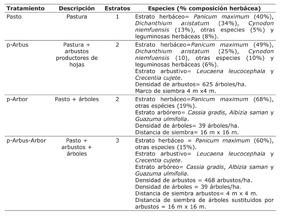 En el año 1998 se establecieron cuatro tipos de sistemas silvopastoriles de diferente estructura y complejidad, más una pradera sin árboles (control). Para efectos de esta investigación solamente fueron usados tres tratamientos silvopastoriles compuestos por tres distintos estratos: pasturas, arbustos y árboles (productores de frutos). El tratamiento control (Pasto) estuvo conformado solo por pasturas (Panicum maximum, Dichanthium aristatum yCynodon nlemfuensis), el primer sistema silvopastoril presentó solamente arbustos (p-Arbus), el segundo modelo incluyó un estrato de árboles (p-Arbor) y el último modelo silvopastoril, la combinación de pasturas, arbustos y árboles (p-Arbus-Arbor). Los sistemas silvopastoriles de alta densidad incluyen más de 10 000 arbustos por hectárea (Broom et al., 2013). Con base en este concepto, los sistemas silvopastoriles trabajados en el presente estudio fueron de baja densidad. Inicialmente las densidades utilizadas en el establecimiento fueron 625 y 159 arbustos/ha en los modelos silvopastoriles p-Arbus y p-Arbor, respectivamente. Para el caso del tratamiento p-Arbus-Arbor, se utilizó un método de sustitución del 25% de la población de arbustos por árboles para obtener tres estratos; en este tratamiento la densidad de arbustos fue de 468/ha, y la de árboles de 159/ha.