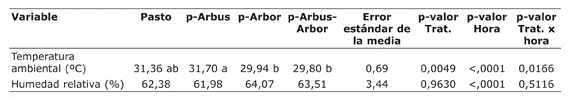 Hubo efecto significativo del tratamiento, de la hora y de la interacción tratamiento x hora sobre la temperatura ambiental (T) (p<0,05). Se encontró 5,0 y 4,5% menos temperatura en los tratamientos silvopastoriles con cobertura arbórea p-Arbus-Arbor y p-Arbor, comparados con el testigo sin árboles, con tendencia significativa en ambos casos (p=0,06 y 0,10, respectivamente). Así mismo, la T en el sistema silvopastoril con solo arbustos (p-Arbus) fue mayor que la de los sistemas silvopastoriles que incluían árboles (p-Arbus-Arbor y p-Arbor) (Cuadro 2). Todos los tratamientos incrementaron la temperatura de forma significativa al pasar del registro am al pm. La temperatura en promedio aumentó 11 °C al pasar de la medición de 6:00 h a las 13:00 h (25,05 vs. 36,35 °C, respectivamente). Hubo diferencia entre tratamientos en la hora de mayor calor (pm), y se encontró una mayor temperatura ambiental (p<0,05) en los tratamientos sin sombra o, sin sombra proveniente de arbustos (pasto y p-Arbus, respectivamente), comparados con los tratamientos p-Arbus-Arbor y p-Arbor, los cuales aportaron sombra de árboles. Los sistemas silvopastoriles con sombra proveniente de árboles (p-Arbus-Arbor y p-Arbor), lograron reducir en promedio 3 °C la temperatura ambiental en la hora pm comparados con los primeros (P<0,05) (Figura 1). En México, los sistemas silvopastoriles intensivos que ofrecen sombra de árboles y arbustos, permitieron reducir en 8,6 °C la temperatura ambiente en las horas de mayor intensidad solar, comparado con los sistemas tradicionales sin sombrío (Solís et al., 2011). (Baliscei et al., 2013) encontraron que el sistema silvopastoril disminuyó la T e hizo el ambiente más armonioso porque disminuyó las diferencias entre las estaciones climáticas verano e invierno.