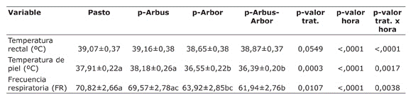 La TP y la FR fueron diferentes entre tratamientos (p< 0,05) y se encontró una tendencia estadística en la TR (p= 0,0549). La hora de evaluación afectó significativamente (p<0,0001) las tres variables con menores valores en la hora más fresca de evaluación (am vs pm). Sin embargo, la respuesta no fue igual en todos los tratamientos y la interacción tratamiento x hora resultó significativa para las tres variables (p<0,05) (Cuadro 3). En la TP hubo un incremento significativo del 11% (p<0,05) en el tratamiento testigo sin árboles ni arbustos (pasto) y en el tratamiento que tenía solo arbustos (p-Arbus), al pasar del registro am al pm (aproximadamente 4 °C), mientras que en el tratamiento con árboles para sombrío (p-Arbor) y en el sistema silvopastoril multiestrato con mayor sombrío (p-Arbus-Arbor) el incremento fue de solo el 2 y 5% (1 y 2 °C), respectivamente.