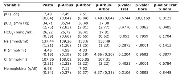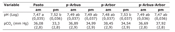 Respecto a los parámetros metabólicos, el tratamiento no presentó efecto significativo (p>0,05) en ninguno de ellos (Cuadro 4) y la hora solo fue significativa (p<0,05); mientras pH, pCO2, Na y Cl. Sin embargo, la variable pH registró una interacción significativa (p<0,05) de los factores tratamiento y hora, y la variable; mientras pCO2registró una leve interacción, indicando respuestas diferentes en los tratamientos entre el horario am-pm (Cuadro 4). En el pH hubo incremento en todos los tratamientos al pasar del registro am al pm, excepto en el sistema silvopastoril multiestrato (p-Arbus-Arbor), en el que se registró disminución. No obstante, la variación solo fue significativa (p<0,05) en el tratamiento testigo.