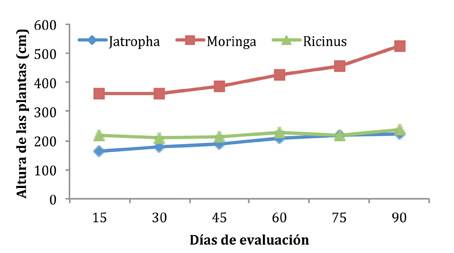 Después de transcurridos los primeros doce meses de establecimiento en campo, las plantas de Jatropha tuvieron una altura superior a 1 m (Figura 1). Durante todo el periodo evaluado los valores variaron entre 1,62 y 2,24 m de altura. Entre los 45 y 60 días el cultivo desarrolló un crecimiento de 0,20 m, influenciado posiblemente por el efecto de las precipitaciones en esta época. Comportamiento similar se observó para la Moringa en este periodo. Sin embargo, para Ricinus el comportamiento fue diferente, ya que las plantas tuvieron un crecimiento más lento (0,10 cm), y la media general fue de 2 m y sin sobrepasar los 3 m. No obstante, hace falta realizar cálculos de tasa relativa de crecimiento, no considerados en este estudio.