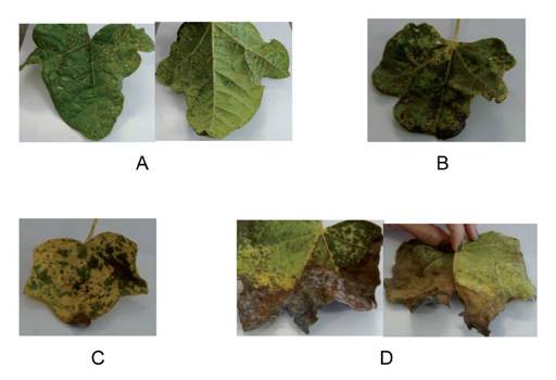 En la última evaluación, no se encontró presencia de insectos ni larvas, pero si se observaron varios síntomas de enfermedades en las hojas (Figura 2), que han sido descritos por varios autores (Erazo, sf; Quiroga et al. 2014) y que puede ser provocado por el hongo Colletotrichum sp., patógeno causante de la antracnosis en Honduras, Brasil y Paraguay. La descripción de estos síntomas están relacionados con manchas foliares de diferentes colores, que generalmente se inician en los bordes de las hojas y, en ocasiones, en el centro. Además, aparecen acérvulos de color café oscuro en el envés de las hojas, en las que a veces las partes afectadas se desprenden, lo que les causa agujeros y reduce de forma notable el área foliar de la planta.