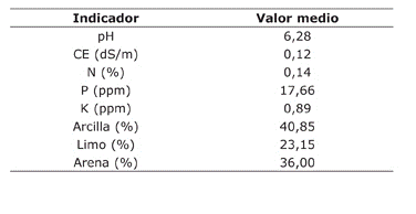 El suelo se clasificó de textura franco arcilloso. De acuerdo con dichos indicadores (Cuadro 1), esta área tiende a ser ligeramente ácida. Es considerado medianamente rico en nitrógeno; los tenores de fósforo disponible y de bases intercambiables (K) fueron altos. Por los niveles de CE es un suelo no salino, por tanto, en función de estas características, puede considerarse de alta fertilidad (Fernández et al., 2006).
