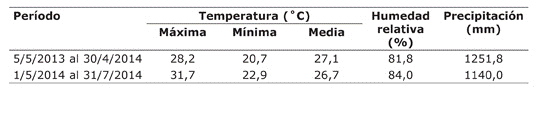 En el Cuadro 2 se muestra el valor total de precipitaciones, así como los valores medios de temperatura máxima, media y mínima y la humedad relativa del primer año de los cultivos y del periodo en el que se realizó el estudio.