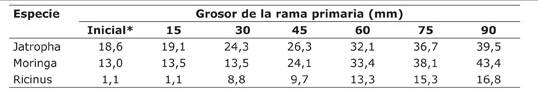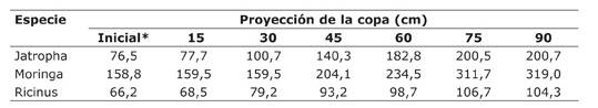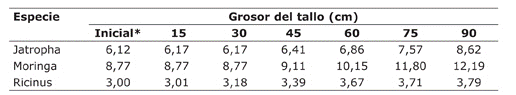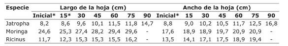 El rango de variación del grosor del tallo, proyección de la copa, grosor de la rama primaria y largo y ancho de la hoja para Jatropha, Moringa y Ricinus durante el periodo de evaluación se observan en los Cuadros 3, 4, 5 y 6, respectivamente.