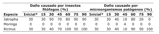 El grado de afectación producido por plagas y agentes patógenos en cada especie se muestran en el Cuadro 7. Como es notable, hasta los sesenta días la Jatropha fue la más afectada, encontrándose la presencia de trips, salta hojas y un insecto de aparato bucal masticador (probablemente grillo o larva de lepidoptero) que no se observó físicamente, pero si se presenciaron muchas hojas dañadas con perforaciones irregulares. Como síntomas se observó que las hojas tienden a engarrotarse (o arrugarse), debido posiblemente a la presencia de una enfermedad causada por un virus. No obstante, la afectación en las plantas no fue representativa. Es notable que entre los días 30 y 45 el porcentaje de plagas y agentes patógenos disminuyó, se destaca que esta etapa coincidió con el comienzo de las lluvias, por lo que pudo ser este un factor beneficioso que influyó en la planta.