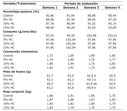El periodo experimental fue de cuatro semanas, durante las cuales las variables estudiadas fueron: producción porcentual, consumo de alimento, peso corporal, mortalidad, peso de huevo y conversión alimenticia.