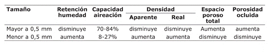 Los valores de densidad aparente y real aumentan a medida que disminuye el tamaño de partícula. Cuando el diámetro de partícula se reduce por debajo de 0,50 mm, la capacidad de aireación se reduce significativamente. Los valores de espacio poroso total y porosidad ocluida incrementan al aumentar el tamaño de partícula (Vargas et al., 2008).