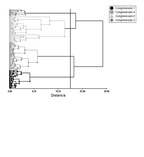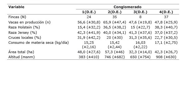 Los resultados de la estadística descriptiva, permitió identificar que el conglomerado cuatro presentó la mayor cantidad de fincas (37), en contraste, el conglomerado tres agrupó solamente a ocho fincas, y los conglomerados uno y tres agruparon 24 y 35 fincas, respectivamente (Cuadro 1). En cuanto al tamaño de hato productivo, sobresalió el conglomerado dos con 66 vacas en producción, mientras que el promedio de animales para los conglomerados 1, 3 y 4 fue de 57, 48 y 48 vacas en producción, respectivamente.
