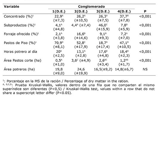 En este estudio, los cuatro grupos resultantes del análisis de conglomerados se definieron como estrategias de alimentación. Los resultados presentados en el Cuadro 2 muestran que las estrategias difirieron principalmente en el uso de alimentos en la dieta, en el tiempo que los animales pasaban en los potreros y en la superficie destinada a pastos de corte.