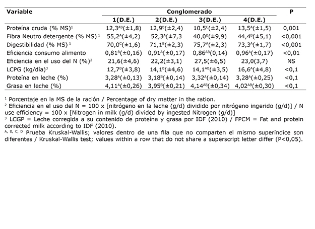 Table 3. Chemical composition of the ration, digestibility, conversion efficiency, and milk production in dairy farms affiliated to Dos Pinos Cooperative grouped in clusters based on the percentage of representativity of type of feed in the diet, areas of forage and cut-and-carry pastures, and the daily time cows spend in pastures. Costa Rica. 2014.