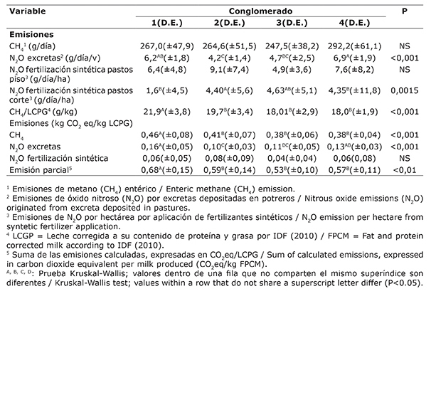 Table 4. Greenhouse gas emissions from dairy farms affiliated to Dos Pinos Cooperative grouped in clusters based on the percentage of type of feed in the diet, areas of forage and cut-and-carry pastures, and the daily time cows spend in pastures. Costa Rica. 2014.
