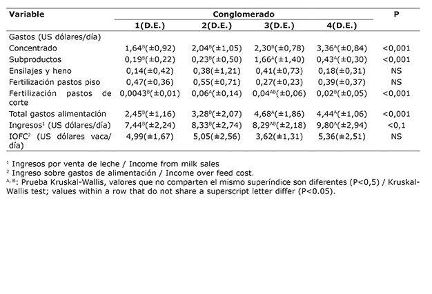 Table 5. Feed costs and income over feed costs (IOFC) in dairy farms affiliated to Dos Pinos Cooperative grouped in clusters based on the percentage of type of food in the diet, areas of forage and cut and carry pastures, and the daily time animals spend in pastures. Costa Rica. 2014.