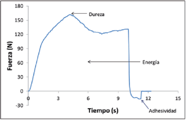 Seis muestras de helado de cada sabor y tipo de leche pre envasadas en recipientes plásticos cilíndricos de superficie lisa de 103,5 ml (3,5 onzas), fueron llevadas a una temperatura aproximada de -15 °C durante las veinticuatro horas previas a la medición. Se mantuvieron a esta temperatura hasta el momento del análisis. Se utilizó un texturómetro TAXTPlus equipado con una celda de carga de 50 kg, empleando una celda cilíndrica de 2,5 cm de diámetro, cuya velocidad de penetración fue de 2 mm/s a una distancia de 20 mm (Roland et al., 1999; Sofjan y Hartel, 2004). Por medio de una prueba de compresión se establecieron las variables de dureza, energía y adhesividad.