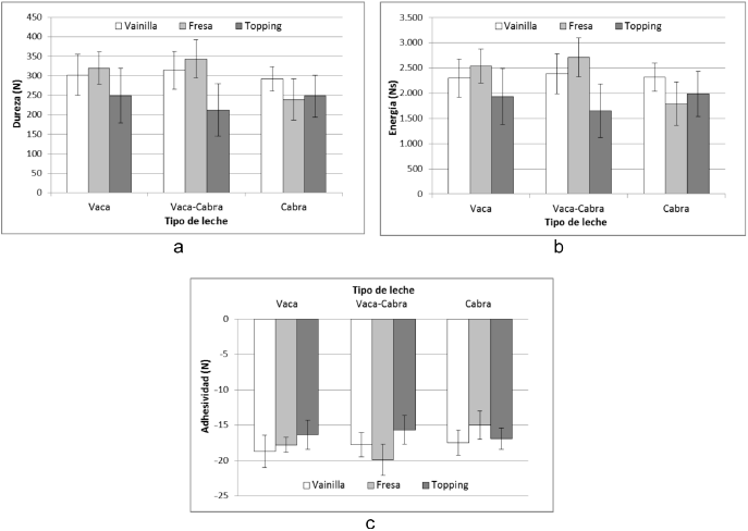 Los resultados de los parámetros de dureza y energía (Figura 4a y 4b) fueron muy similares en todos los tratamientos. En comparación con el producto preparado con solo leche de vaca, la dureza y energía de los helados de vainilla y fresa aumentaron en el producto preparado con la mezcla de leches y disminuyeron con la leche de cabra, sobre todo para el sabor de fresa. Los helados con topping obtuvieron los menores valores de dureza y energía en los productos que contenían alguna proporción de leche de vaca, y fue menor en el caso de la mezcla, en tanto que en el producto preparado con solo leche de cabra el helado con topping tuvo valores intermedios entre los otros dos sabores.