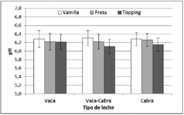 Para todos los tipos de leche, el pH de los helados de vainilla resultó superior al de los productos con sabor a fresa y con topping. La adición de topping se asoció con una disminución de pH, principalmente en las formulaciones que contenían alguna proporción de leche de cabra. La acidez aportada por la fruta del topping explica el comportamiento observado (Güven y Karaca, 2002). Las diferencias estadísticas en la acidez no repercutieron en el agrado sensorial, tal y como se estudiará más adelante.