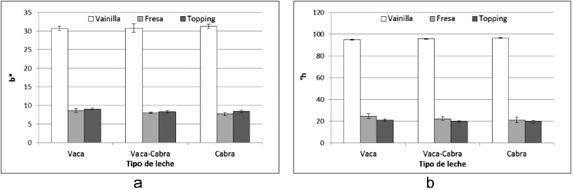 La Figura 6 muestra el efecto del tipo de leche y del sabor sobre los parámetros b* y °h. El valor b* se refiere a la coordenada del color que representa al eje amarillo (+) y azul (-) (Lauro et al., 2005); debido a ello es que el valor de b* de los helados de vainilla tendieron a valores elevados, mientras que los de fresa y topping tienden a valores bajos. En el caso de los productos con leche caprina en su formulación, el helado de vainilla presentó valores superiores y los helados de fresa y topping valores inferiores de b* y °h en comparación con las formulaciones con leche de vaca, generando la interacción antes mencionada.