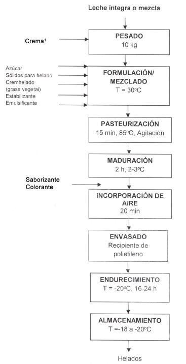 La pasteurización se realizó por lotes, utilizando una pasteurizadora modelo PEB 60, la cual alcanzó una temperatura de pasteurización de 85 °C durante quince minutos, después de lo cual la misma máquina efectuó un choque térmico por enfriamiento rápido hasta llevar la mezcla a los 4 °C. Finalizado este proceso térmico, dio comienzo la etapa de maduración, trasladándose la mezcla a una maduradora modelo TME 60 y manteniéndose con agitación mecánica constante dos horas a una temperatura entre 2 °C y 5 °C. Una vez concluida la maduración, los colorantes y saborizantes se añadieron a la mezcla aun en agitación, según correspondiese (Cuadro 1).