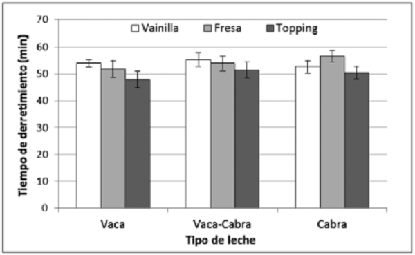 De manera general, el tiempo de derretimiento de los helados fue mayor al utilizar el sabor de vainilla. Sin embargo, al haber una interacción entre el sabor y el tipo de leche, entre los productos preparados con 100% leche de cabra, el helado de fresa obtuvo el mayor tiempo de derretimiento.
