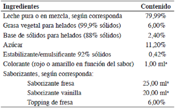 Se elaboraron cuatro lotes diferentes de helados. Cada lote incluyó tres sabores distintos (fresa, topping5 de fresa y vainilla), utilizando tres niveles de inclusión de leche (100% vaca, 100% cabra y mezcla 50%:50% vaca-cabra). Los cuatro lotes se realizaron utilizando una formulación de helado base establecida, según se muestra en el Cuadro 1, donde las únicas variaciones fueron el sabor/color y el tipo de leche.