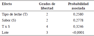 Table 3. Probabilities associated with the analysis of variance for the evaluation of overrun in ice cream made with goat and bovine milk. San José, Costa Rica. 2015.