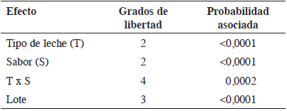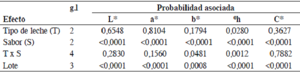 El tipo de leche empleada en la elaboración de los helados presentó un efecto significativo (p<0,05) únicamente sobre el parámetro °h (Cuadro 7). Caso contrario ocurrió al considerar el factor sabor, pues tuvo un efecto (p<0,0001) sobre todos los parámetros de color evaluados. El sabor y el tipo de leche presentaron interacciones significativas para las variables b* y ºh (Cuadro 7).
