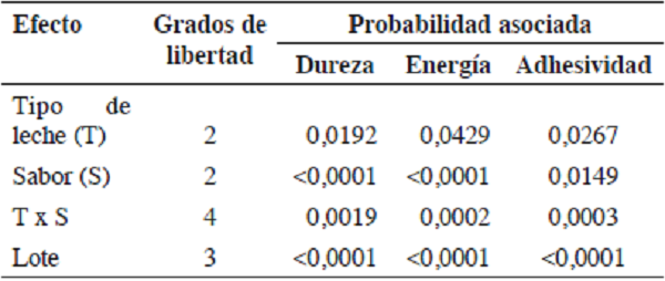 Al evaluar por medio de ANDEVA las variables asociadas a la textura (Cuadro 5), fue posible establecer la existencia de una interacción significativa entre el tipo de leche empleada y el sabor del helado sobre la dureza, la energía y la adhesividad.