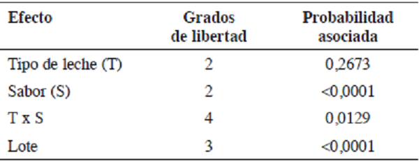 Adicionalmente, se realizó un panel de consumidores, cuyos resultados de aceptación se analizaron por medio de conglomerados (clusters) por el método de Ward, seguido de un análisis de varianza del tipo de leche y sabor para cada conglomerado. Se consideró que había efecto significativo con un p<0,05.