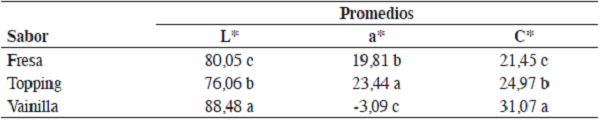 Los valores más elevados para el parámetro L* se obtuvieron para el helado de vainilla, mientras los más bajos se registraron para el helado con topping de fresa (Cuadro 8). Esto fue congruente con lo esperado, dado que este parámetro indica la luminosidad en una escala del blanco (100) al negro (0); por lo tanto, a mayores valores de L* el color del producto tiende a ser más al blanco, como se infiere de lo reportado por MacDougall (2002), especialmente considerando que la presencia de trozos de fresa generan un color que tiende a tonalidades oscuras.
