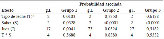 Al analizar los efectos relacionados con el agrado general en cada conglomerado (Cuadro 9), solo los consumidores del primer grupo percibieron una diferencia significativa entre los tipos de leche con que se elaboraron los helados (p<0,05) (Cuadro 10).