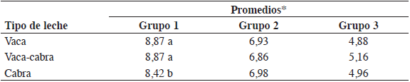 * En la columna correspondiente al grupo uno, los promedios con letra diferente presentandiferencias significativas (p<0,05) / In the column corresponding to group one, means withdifferent letter are significantly different (p<0.05).En el grupo 1, los consumidores tuvieron una predilección significativa por los productos con leche de vaca en su formulación. Sin embargo, todos los helados, incluyendo los preparados con solo leche de cabra, tuvieron valores de agrado elevados (superiores a 8), lo cual se pudo atribuir a la alta frecuencia de consumo de helados manifestada por los sujetos pertenecientes a este grupo, lo que a su vez se pudo asociar a una mayor familiaridad con todo tipo y calidad de helados.