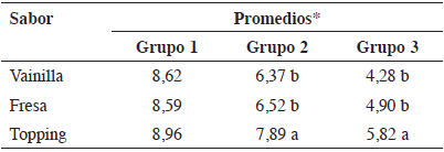 * En la columna correspondiente al grupo uno, los promedios con letra diferente presentandiferencias significativas (p<0,05) / In the column corresponding to group one, means withdifferent letter are significantly different (p<0.05).Table 11. Average liking score of ice cream with different flavors for each consumers group, and significant differences in groups 2 and 3 compared by Tukey’s test. San José, Costa Rica. 2015.