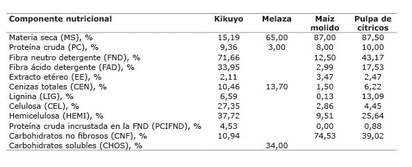Los valores bromatológicos del kikuyo (Cuadro 1) mostraron un valor proteico bajo, un alto contenido de fibra neutro detergente y una concentración media de fibra ácido detergente en base seca, debido a la edad de rebrote y a su estado fenológico: seis a siete hojas apicales verdes, tres a cinco hojas senescentes y un tallo de 70 a 90 cm de largo, con ocho a once vainas foliares en proceso de pudrición húmeda, adheridas a los nudos del tallo.