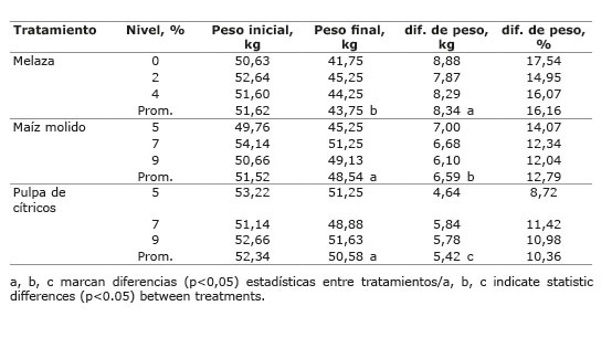 Entre el peso inicial del forraje verde con el aditivo agregado y el peso final obtenido de ensilado (Cuadro 2) se presentaron pérdidas significativas (p<0,05) de materia verde en los tres aditivos, siendo la menor de un 10% cuando se empleó pulpa de cítricos, un 13% con maíz molido y un máximo de16% con el agregado de melaza. No se observaron diferencias importantes (p>0,05) entre los niveles de cada tratamiento.