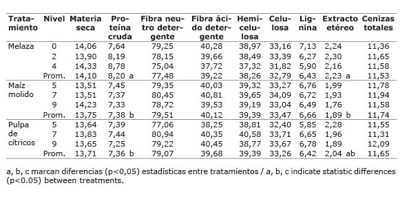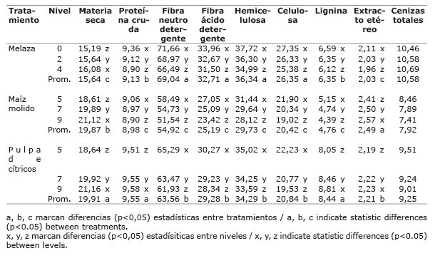 Se usó un diseño de bloques completos al azar (Steel y Torrie, 1988) con cuatro repeticiones y nueve tratamientos en arreglo factorial (3 x 3). Los factores fueron tres aditivos: melaza, maíz molido y un peletizado de pulpa de cítricos, cada uno en tres niveles. Con base en los análisis bromatológicos iniciales, realizados una semana previa, se determinó el contenido de materia seca, proteína cruda, fibra neutro detergente, fibra ácido detergente, lignina, hemicelulosa y celulosa, extracto etéreo, cenizas, la proteína incrustada en la fibra neutro detergente y los carbohidratos no fibrosos (NRC, 2001), mediante la siguiente fórmula: