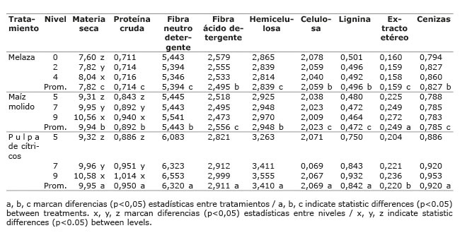 La cantidad inicial de materia seca entre los tres aditivos resultó significativa (p<0,05), con valores de 7,82 kg/bolsa en el tratamiento con melaza contra 9,94 y 9,95 en los tratamientos con maíz molido y de pulpa de cítricos, respectivamente. Se observaron variaciones altamente significativas (P<0,01) entre los niveles aplicados, correspondientes a un incremento en los kg de materia seca conforme aumentó el nivel de los aditivos. El contenido de proteína cruda tuvo el mismo comportamiento entre los aditivos. Se observó una tendencia creciente en la cantidad de proteína (p>0,05) conforme aumentó el nivel de adición de melaza, no así entre los niveles de adición de maíz molido y pulpa de cítricos. La fracción fibrosa mostró diferencias (p<0,05) entre los aditivos empleados, con una diferencia real poco apreciable entre la adición de melaza y de maíz molido, pero una diferencia amplia entre la cantidad de fibra neutro detergente al comparar estos dos aditivos contra la adición de pulpa de cítricos. Similar respuesta se encontró en los componentes de la fibra, el extracto etéreo y las cenizas totales, apreciándose diferencias importantes (p<0,01) entre los aditivos y poca variación (p>0,05) entre los niveles aplicados de cada uno de ellos (Cuadro 5).
