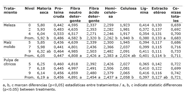 En todos los nutrientes se manifiestaron diferencias (p<0,05) entre los niveles de aditivo agregado. El contenido de materia seca del material ensilado resultante al final del experimento (Cuadro 4), y la concentración de fibra neutro detergente y sus componentes, no presentaron diferencias de importancia (p>0,05) entre aditivos. Sí se mostraron diferencias significativas (p<0,05) en los contenidos de proteína cruda y de extracto etéreo, siendo la melaza el aditivo que conservó mejor ambas fracciones nutricionales. A pesar de lo anterior, no se observaron variaciones significativas (p>0,05) entre los niveles de los aditivos en ninguno de los nutrientes estudiados, lo que sugiere una uniformización cualitativa del ensilado al término del trabajo experimental (2 ½ meses) entre los tres tipos de aditivo empleados, e incluso independientemente del nivel de aditivos agregados.